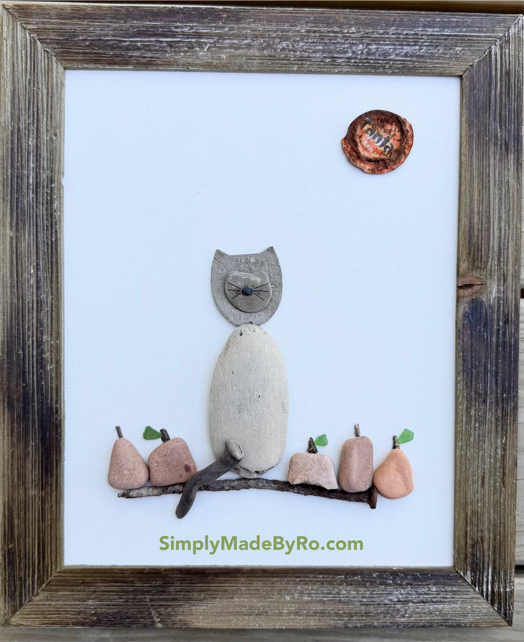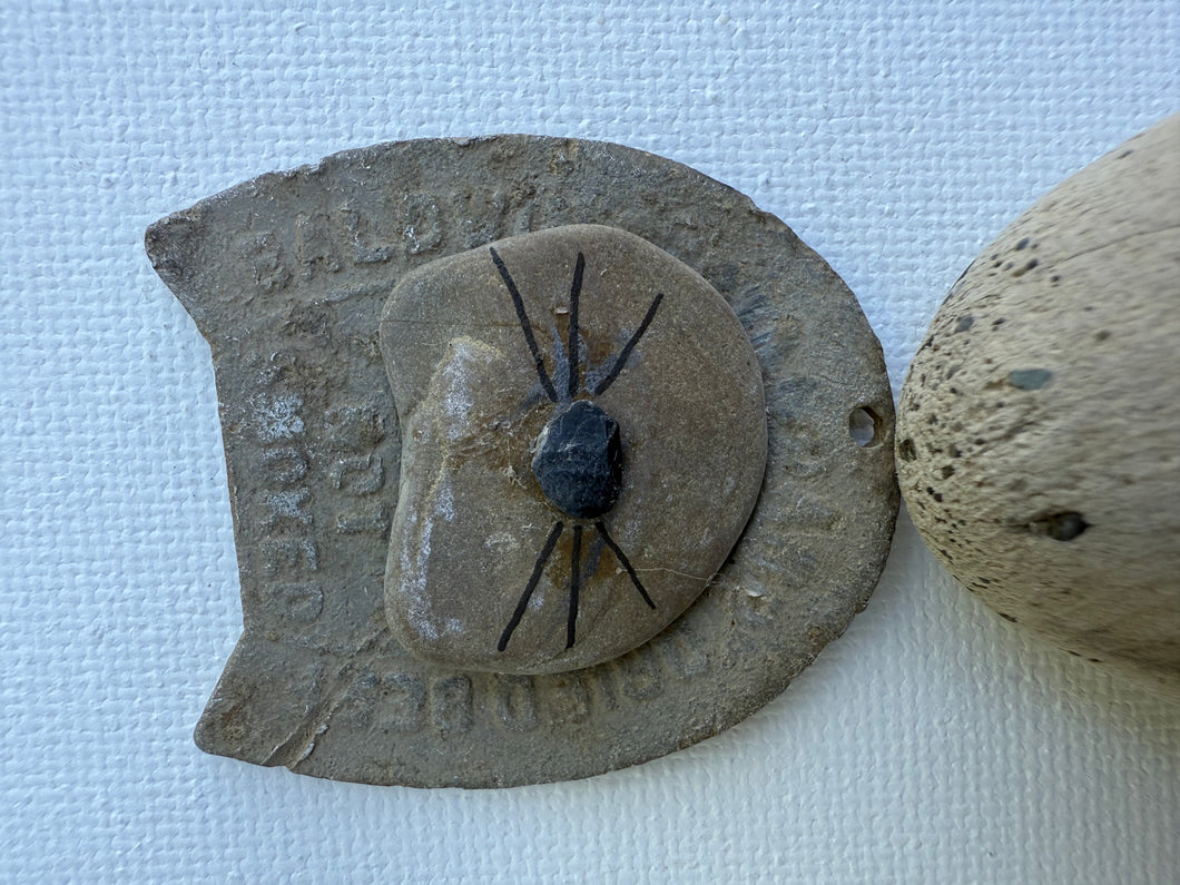 This artwork features these materials: rusty metal from Arizona, sea pottery from Solit Croatia, sea glass & driftwood from California, pebbles from Lake Erie (head) & Alaska (nose), wood and metal heel plate metal detector find from New York.
