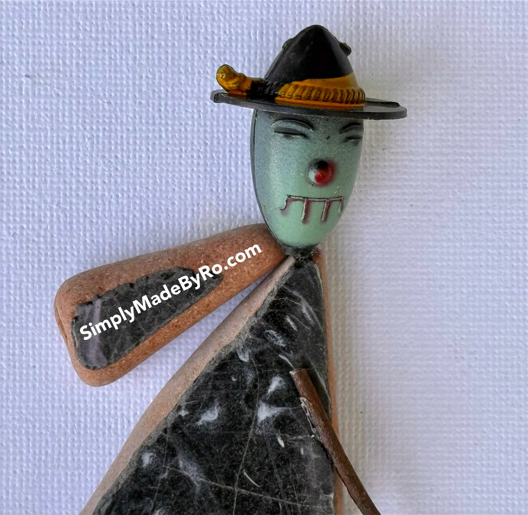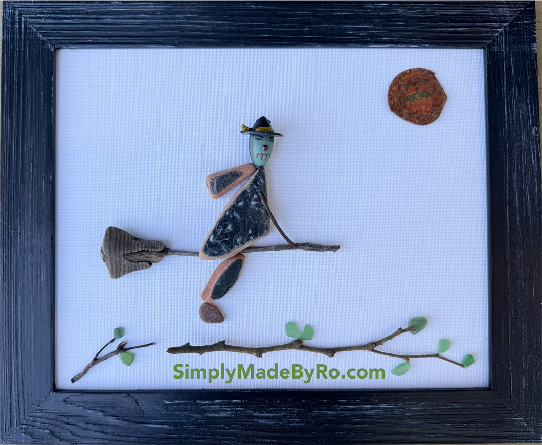 This artwork features these materials: rusty metal from Arizona, sea pottery from Split Croatia, sea glass & driftwood from California, wood from New York and a vintage witch.